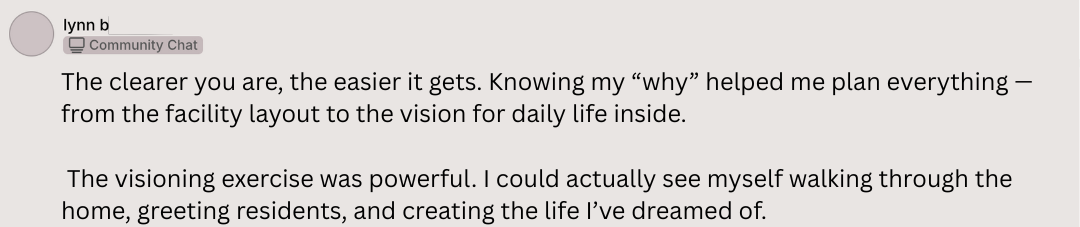 Uncover the driving force behind your assisted living business. You’ll get crystal clear on your personal “why” and paint a picture of the kind of home you want to create — so you can stop second-guessing yourself and finally feel confident you’re on the right path.