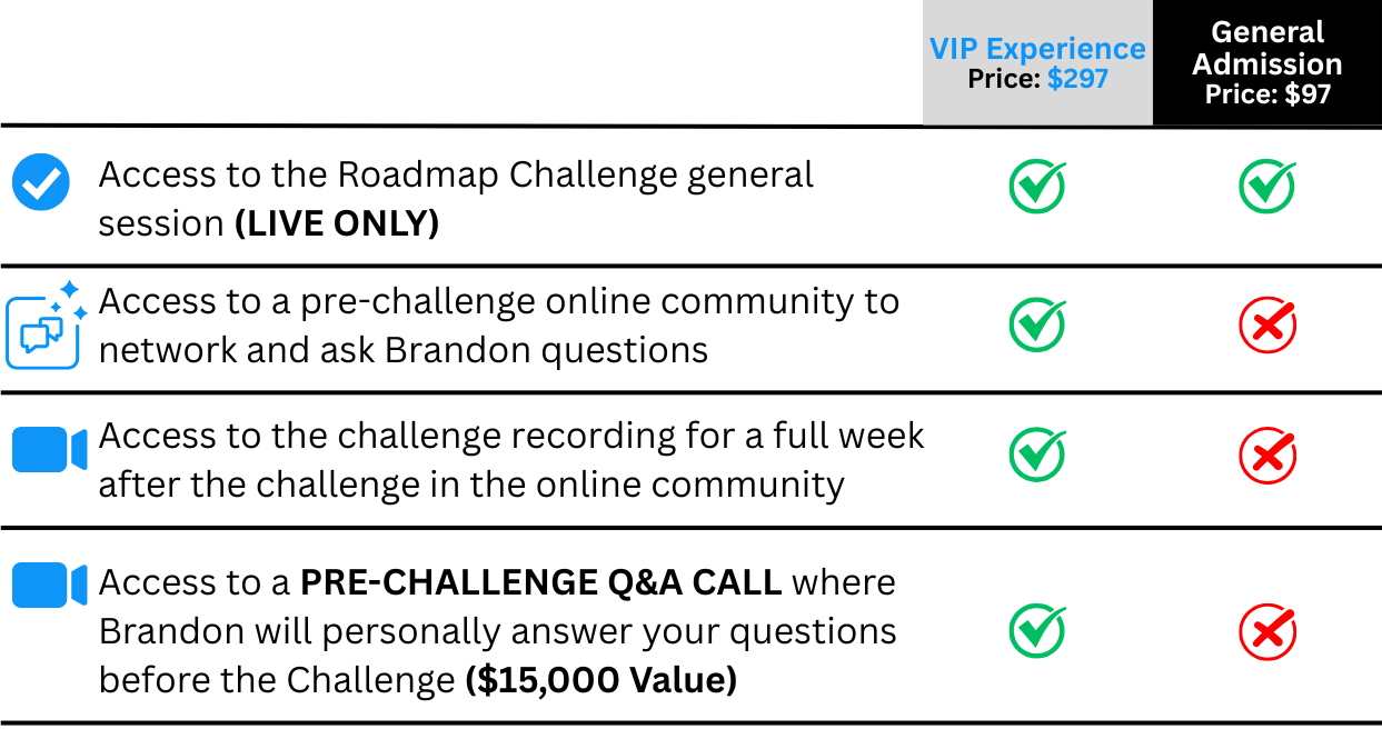 Everything in General + Exclusive Q&A Hot Seats with Brandon before the challenge + Access to the challenge recording for the rest of the week + Private VIP Community.